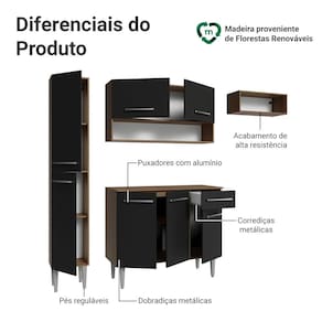 Esta composição inclui um paneleiro com duas portas, um balcão de 105 cm com três portas e uma gaveta, um armário aéreo de duas portas e um nicho aberto, oferecendo amplo espaço para armazenamento e organização. O acabamento em tom amadeirado Rustic e Preto dá à sua cozinha um visual elegante e moderno.