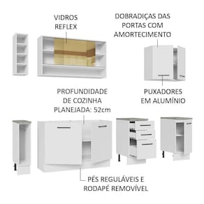 Qualidade não vai faltar na sua cozinha, já que este armário possui puxadores com alça em alumínio, gavetas com corrediças telescópicas de abertura total, portas com amortecimento para fechamento suave, vidro reflex no aéreo e pés reguláveis em PVC.