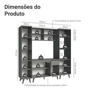 - 52 cm de profundidade nos módulos inferiores e 31 cm nos aéreos