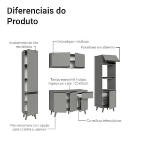 Focado na qualidade, o móvel conta com puxadores em alumínio na coloração titanium, corrediças telescópicas para abertura total das gavetas e dobradiças metálicas resistentes.
