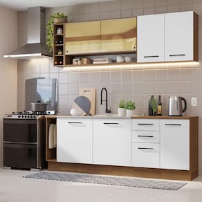 Qualidade não vai faltar na sua cozinha, já que este armário possui puxadores com alça em alumínio, gavetas com corrediças telescópicas de abertura total, portas com amortecimento para fechamento suave, vidro reflex no aéreo e pés reguláveis em PVC.