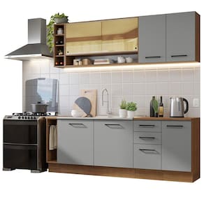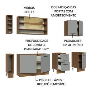 Qualidade não vai faltar na sua cozinha, já que este armário possui puxadores com alça em alumínio, gavetas com corrediças telescópicas de abertura total, portas com amortecimento para fechamento suave, vidro reflex no aéreo e pés reguláveis em PVC.