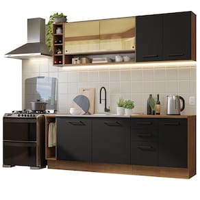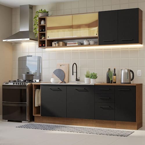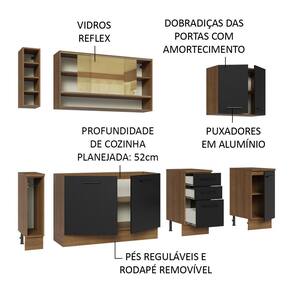 Qualidade não vai faltar na sua cozinha, já que este armário possui puxadores com alça em alumínio, gavetas com corrediças telescópicas de abertura total, portas com amortecimento para fechamento suave, vidro reflex no aéreo e pés reguláveis em PVC.