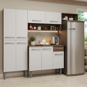 Composta por paneleiro duplo, balcão e armário aéreo e ainda você pode acomodar sua geladeira, essa cozinha permite organizar os módulos conforme a necessidade do seu ambiente, oferecendo amplo espaço interno para guardar utensílios, louças e eletrodomésticos, tornando o dia a dia mais prático.