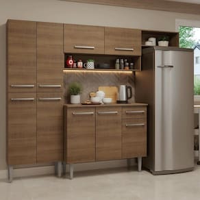 Composta por paneleiro duplo, balcão e armário aéreo e ainda você pode acomodar sua geladeira, essa cozinha permite organizar os módulos conforme a necessidade do seu ambiente, oferecendo amplo espaço interno para guardar utensílios, louças e eletrodomésticos, tornando o dia a dia mais prático.