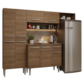 A linha Emilly se destaca pelo acabamento de alta resistência, puxadores em alumínio, corrediças e dobradiças metálicas, garantindo durabilidade no uso diário. Os pés reguláveis proporcionam estabilidade e facilitam a limpeza. O acabamento em tom amadeirado Rustic valoriza o ambiente, unindo design elegante e aconchegante.