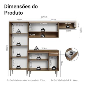- 44 cm de profundidade nos balcões e 27cm nos aéreos/paneleiro