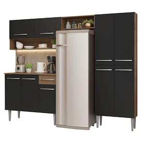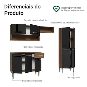 A linha Emilly se destaca pelo acabamento de alta resistência, puxadores em alumínio, corrediças e dobradiças metálicas, garantindo durabilidade no uso diário. Os pés reguláveis proporcionam estabilidade e facilitam a limpeza, tornando sua rotina mais prática. O acabamento em tom amadeirado Rustic e preto traz estilo contemporâneo para sua cozinha.