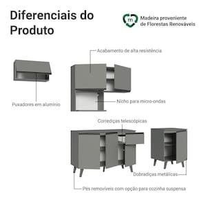 - 52 cm de profundidade nos balcões, 31 cm nos aéreos e 45 cm no nicho para micro-ondas