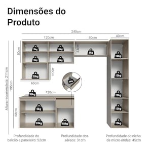 - 52 cm de profundidade no balcão e paneleiro, 31 cm nos aéreos e 45 cm no nicho para micro-ondas