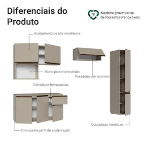 O balcão conta com dobradiças metálicas nas portas e puxadores em perfil de alumínio, discretos e resistentes. As gavetas possuem corrediças que permitem abertura total. O tampo é removível, possibilitando a instalação de cuba ou pedra e o acabamento é de alta resistência, garantindo durabilidade.