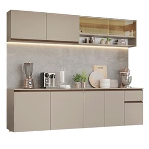 A Cozinha Completa de 240 cm é ideal para quem busca praticidade, estilo e bom aproveitamento de espaço. Seus principais diferenciais estão no armário aéreo com portas de vidro reflex, que adiciona um toque sofisticado ao ambiente, e na instalação suspensa dos módulos, que proporciona um visual moderno e facilita a limpeza da cozinha no dia a dia.
