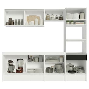 Para completar, o acabamento da estrutura é branco e as portas e frentes são pretas. É feito em Poliéster Protetor ecológico, que consiste na aplicação de 7 camadas resistentes a álcool, água e calor.