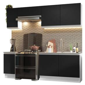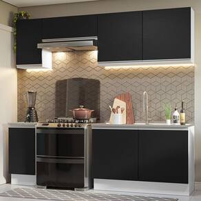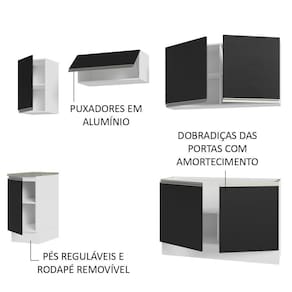 Para completar, o acabamento da cozinha é branco, e o das portas e frentes é preto. Feito em Pintura Poliéster ecológica, que consiste na aplicação de 7 camadas de proteção resistentes a álcool, água e calor.