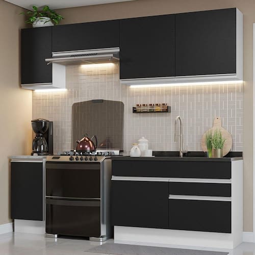 Para completar, o acabamento da estrutura é branco e o das portas e frentes é preto. Feito em Pintura Poliéster ecológica, que consiste na aplicação de 7 camadas de proteção resistentes a álcool, água e calor.