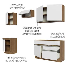 A fabricação é feita com materiais de qualidade, como corrediças telescópicas, puxadores com perfil total em alumínio, dobradiças com amortecimento e pés reguláveis em PVC, com rodapé removível em MDP.