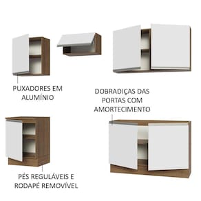 Este móvel vem equipado com puxadores de alumínio e fechamento suave das portas graças aos amortecedores. Para completar, possui pés reguláveis em PVC e rodapé removível em MDP.