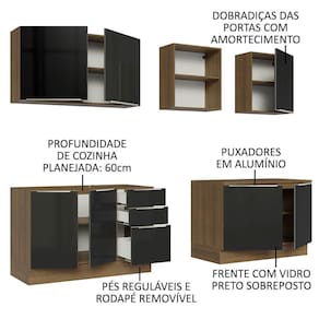 Um grande destaque são as portas e gavetas, que recebem um vidro preto aplicado e revestimento metálico nas bordas, diferenciais que trazem muita elegância ao seu ambiente.