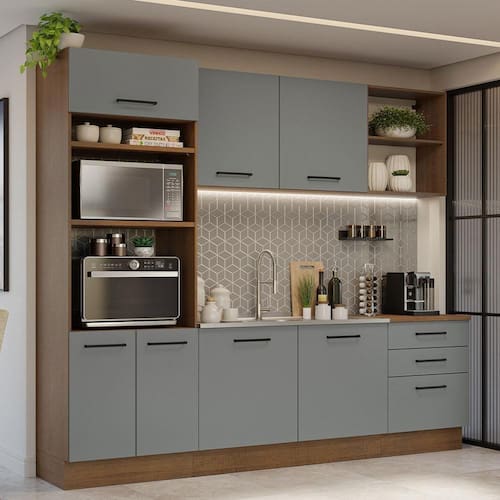 Para completar, a organização de todos os itens da cozinha vai ficar mais fácil, já que o móvel conta com diversas gavetas, prateleiras e nichos. A torre oferece espaço para forno e micro-ondas e o balcão maior tem espaço para pia de inox ou pedra, nas medidas de 120 x 52 cm.