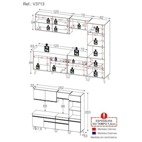 Dimensões do produto montado: Altura: 203cm | Largura: 252cm | Profundidade: 32cm (aéreos) - 53cm (balcão com tampo e paneleiro) *Você pode consultar as medidas internas na imagem técnica do produto.