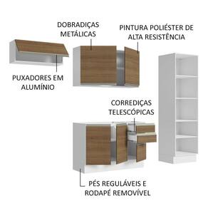 A fabricação é feita 100% em MDF, material resistente e proveniente de florestas renováveis. Além disso, é composta por itens de qualidade, como puxadores em alumínio, dobradiças metálicas, corrediças telescópicas e pés reguláveis em PVC, com rodapé removível em MDF.