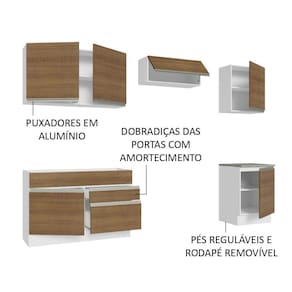 Para completar, o acabamento da estrutura é branco e o das portas e frentes é no padrão amadeirado Rustic. Feito em Pintura Poliéster ecológica, que consiste na aplicação de 7 camadas de proteção resistentes a álcool, água e calor.