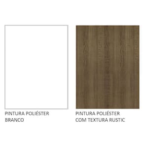 Por fim, o acabamento da estrutura é branco e as portas e frentes são em amadeirado Rustic. É feito em Poliéster Protetor ecológico, que consiste na aplicação de 7 camadas resistentes a álcool, água e calor.
