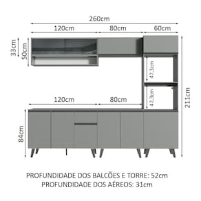 Medidas totais: - 260 cm de largura - 211 cm de altura - 52 cm de profundidade nos balcões e na torre e 31 cm nos aéreos