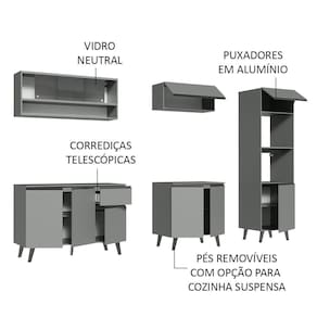 A fabricação segue padrões de alta qualidade, além de contar com materiais nobres, como puxadores em alumínio na coloração titanium, corrediças telescópicas para abertura total da gaveta, dobradiças metálicas nas portas e vidro no estilo neutral no aéreo.