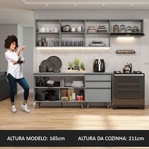 O acabamento da cozinha é cinza, feito em Pintura Poliéster ecológica, que oferece proteção contra os efeitos da água e do calor.