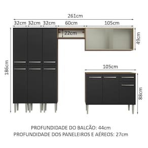 - 44 cm de profundidade no balcão e 27 cm de profundidade nos aéreos e nos paneleiros