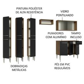E pensando na durabilidade do móvel, a cozinha é fabricada com materiais de muita qualidade. Conta com corrediças e dobradiças metálicas, puxadores com alumínio e pés reguláveis em PVC, detalhes que garantem maior resistência.