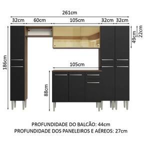 - 44 cm de profundidade no balcão e 27 cm de profundidade nos aéreos e nos paneleiros