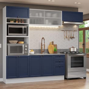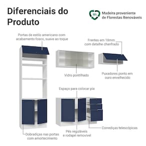 O acabamento de alta resistência da estrutura é em Branco, das frentes em Azul e possui uma textura suave ao toque. O destaque fica por conta dos puxadores ponto em ouro envelhecido, feitos com metal resistente, trazem personalidade e um charme único. Outro diferencial está no detalhe chanfrado das frentes, que forma molduras elegantes e dá profundidade ao design.