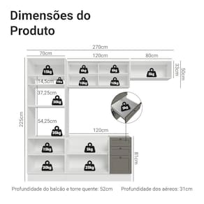 - 52 cm de profundidade nos balcões/nichos e 31cm nos aéreos