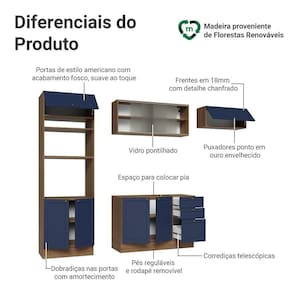 O acabamento de alta resistência da estrutura é em tom amadeirado Rustic, das frentes em Azul e possui uma textura suave ao toque. O destaque fica por conta dos puxadores ponto em ouro envelhecido, feitos com metal resistente, trazem personalidade e um charme único. Outro diferencial está no detalhe chanfrado das frentes, que forma molduras elegantes e dá profundidade ao design.