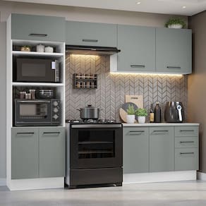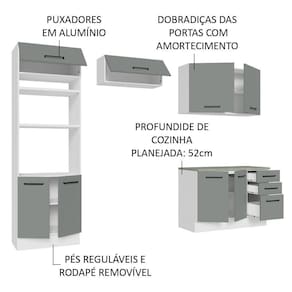 O balcão de pia acompanha tampo, mas também é possível fazer a instalação de pia de inox ou pedra. Já a torre traz espaço para forno e micro-ondas. Além disso, os pés são reguláveis em PVC e o rodapé removível em MDP, tornando a limpeza muito mais fácil.