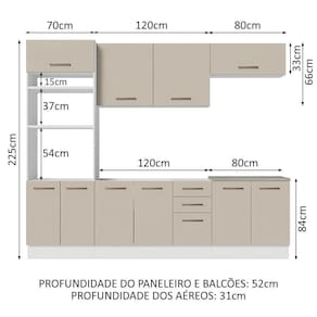 Medidas totais: - 225 cm de altura - 270 cm de largura - 52 cm de profundidade nos módulos inferiores e 31 cm nos aéreos