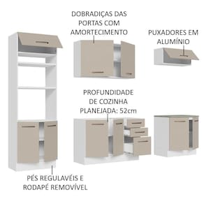 Os materiais utilizados são de padrão superior, como os puxadores com alça em alumínio, as gavetas com corrediças telescópicas de abertura total, portas com amortecimento para fechamento suave e pés reguláveis em PVC, com rodapé removível em MDP.