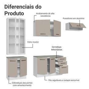 O móvel se destaca pelos puxadores com alça em alumínio e gavetas com corrediças telescópicas de abertura total. Possui ainda portas com amortecimento para fechamento suave e pés reguláveis em PVC.
