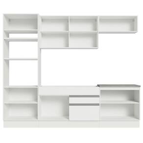 Os vários aéreos e balcões possuem ótimo espaço interno e externo. A torre quente conta com nichos especiais para forno e micro-ondas. Além disso, o balcão maior comporta pias de inox ou pedra e o balcão de 80 cm pode ser recortado para a instalação de cooktop.