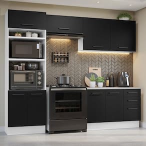 Com este modelo completo da linha Agata da Madesa, você terá ao seu alcance uma cozinha planejada, com ótimo custo-benefício, sofisticação e funcionalidade.O móvel é composto por materiais de alta qualidade, como puxadores em alumínio, gavetas com corrediças telescópicas de abertura total e portas com amortecimento para fechamento suave.O balcão de pia acompanha tampo, mas também é possível fazer a instalação de pia de inox ou pedra. Já a torre traz espaço para forno e micro-ondas. Além disso, os pés são reguláveis em PVC e o rodapé removível em MDP, tornando a limpeza muito mais fácil.O acabamento da estrutura é branco e o das portas e frentes é preto. É feito em Pintura Poliéster, com 7 camadas de proteção resistentes a álcool, água e calor.E para completar, você pode complementar sua cozinha futuramente com módulos avulsos da linha Agata da Madesa. E aí, que tal garantir agora mesmo a sua?Medidas totais:- 225 cm de altura- 270 cm de largura- 52 cm de profundidade no balcão e na torre e 31 cm nos aéreosItens inclusos:- Uma (1) Torre de 70 cm com três (3) portas e três (3) nichos- Um (1) Aéreo de 80 cm com uma (1) porta basculante- Um (1) Aéreo de 120 cm com duas (2) portas- Um (1) Balcão de Pia de 120 cm com duas (2) portas e três (3) gavetas e tampoCódigo do produto: GRAG27000773Obs.:- As imagens são meramente ilustrativas, os eletros e a decoração não acompanham o produto- Por segurança, é obrigatório fixar a torre na parede- A Madesa não disponibiliza serviço de montagem- O produto segue com manual e todas as ferragens necessárias para a instalação1 O produto vem montado? Se não, vocês realizam a montagem?R.: A Madesa não disponibiliza serviço de montagem. Todos os produtos seguem com manual de instalação e as ferragens necessárias. Alguns produtos possuem vídeo explicando o passo a passo da montagem.2 Vocês possuem loja física? Posso retirar meu produto em mãos?R.: Não possuímos loja física, apenas loja virtual. Confira as opções de envio ao colocar o seu CEP.3 Qual é o valor do envio? Posso pagar separadamente?R.: O valor do envio é calculado com base no peso e volume do produto, e no CEP de destino. Você pode calcular o valor e prazo de entrega no simulador.4 A Madesa entrega em todo Brasil? Como é feita a entrega?R.: Sim, entregamos no Brasil inteiro através de transportadoras parceiras.5 Os produtos possuem garantia?R.: Sim. A Madesa oferece 3 meses de garantia para defeitos de fabricação. Cor: Preto | Garantia: 3 meses contra defeitos de fabricação | Dimensões - Altura: 225 cm | Dimensões - Largura: 270 cm | Dimensões - Profundidade: 52 cm | Produto: Cozinha | Marca: Madesa | Peso aproximado: 149 kg | Material: MDP | RBN: Casa/Móveis/Móveis de Cozinha | Estado de Origem: RS | Material para Filtro: MDP | Conteúdo da embalagem: 1 Cozinha Completa | Instruções/Cuidados: Utilize um pano limpo, levemente umedecido e seque em seguida a superfície. Não usar produtos químicos ou abrasivos para a limpeza. Recomendamos polir seu móvel com lustra-móveis duas a três vezes por ano. | Quantidade de gavetas: 3 | Quantidade de portas: 8 | Produto precisa de Montagem?: Sim, sugerimos a contratação do nosso serviço de montagem (para os CEPs em que o serviço está disponível) ou de algum profissional experiente de sua preferência | Inclui tampo: Sim | Altura do Produto com Embalagem (cm): 75.7 | Largura Produto Com Embalagem (cm): 61.5 | Comprimento Produto Com Embalagem (cm): 229.1 | Peso Produto Com Embalagem (Kg): 149 | Descrição do Tamanho: 225 cm x 270 cm x 52 cm | Nome do Simples no Fornecedor: Armário de Cozinha Completa 270cm Branco/Preto Agata Madesa 07 | Contato do Fabricante: contato@madesa.com | Fabricante: Madesa Cor: Branco/Preto