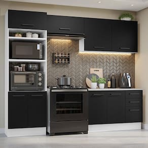 O balcão de pia acompanha tampo, mas também é possível fazer a instalação de pia de inox ou pedra. Já a torre traz espaço para forno e micro-ondas. Além disso, os pés são reguláveis em PVC e o rodapé removível em MDP