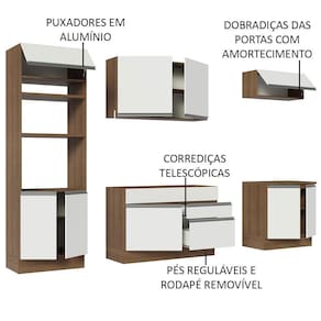 Com design atual, conta com materiais de alto padrão, como puxadores de perfil total em alumínio, corrediças telescópicas nas gavetas, amortecedores para fechamento suave das portas e pistão a gás na porta basculante. Além disso, possui pés reguláveis em PVC e rodapé removível.