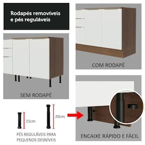 Possui puxadores slim em alumínio, gavetas com corrediças telescópicas, portas com amortecimento para fechamento suave. Além disso, os pés são reguláveis em PVC, com rodapé removível de MDP.