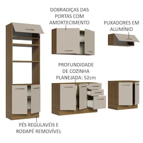 Os materiais utilizados são de padrão superior, como os puxadores com alça em alumínio, as gavetas com corrediças telescópicas de abertura total, portas com amortecimento para fechamento suave e pés reguláveis em PVC, com rodapé removível em MDP.