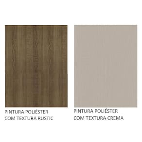 O acabamento da estrutura é em amadeirado Rustic e o das portas e frentes é na coloração Crema. É feito em Pintura Poliéster ecológica com sete camadas, que destaca a tonalidade e protege o móvel.