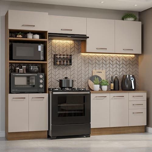 O acabamento da estrutura é em amadeirado Rustic e o das portas e frentes é na coloração Crema. É feito em Pintura Poliéster, com 7 camadas de proteção resistentes a álcool, água e calor.