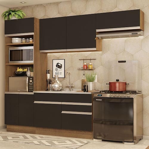 O acabamento da cozinha combina os tons amadeirado Rustic e preto. É feito em Pintura Poliéster, com 7 camadas que protegem o móvel dos efeitos do álcool da água e do calor.