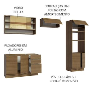 Itens inclusos: - Um (1) Aéreo com duas (2) portas de correr de vidro reflex - Um (1) Balcão para Pia com três (3) gavetas e duas (2) portas (Não acompanha tampo) - Um (1) Aéreo com uma (1) porta basculante - Uma (1) Torre Quente com dois (2) nichos para fornos e três (3) portas